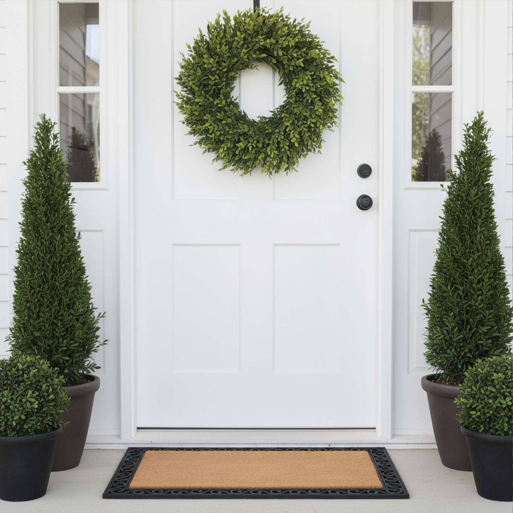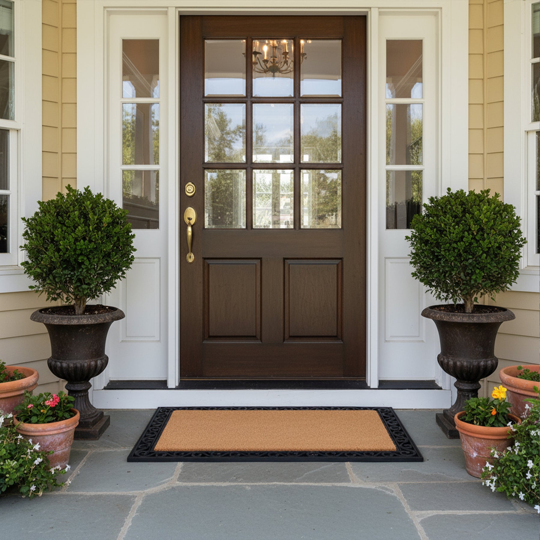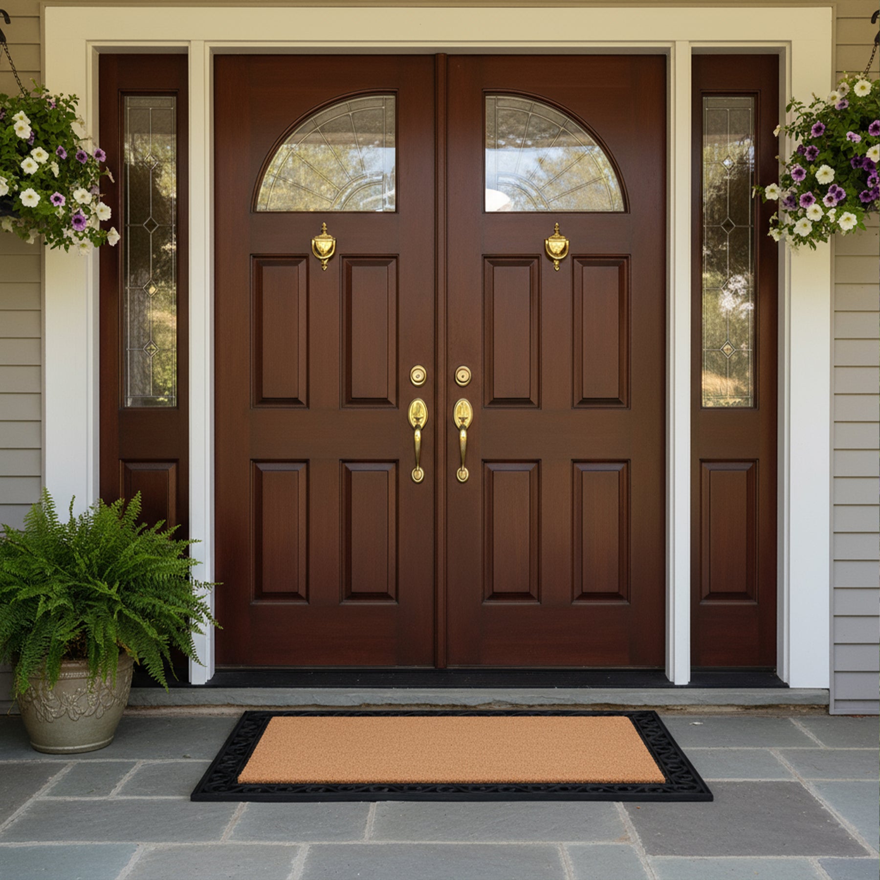 The beautiful combination of coir and rubber in this doormat make a stylish reception for your guests. While the heavy-duty rubber adds weight and elegance, the coir acts as a natural scraper on shoes to keep debris from entering your home. Sweep or hose clean.