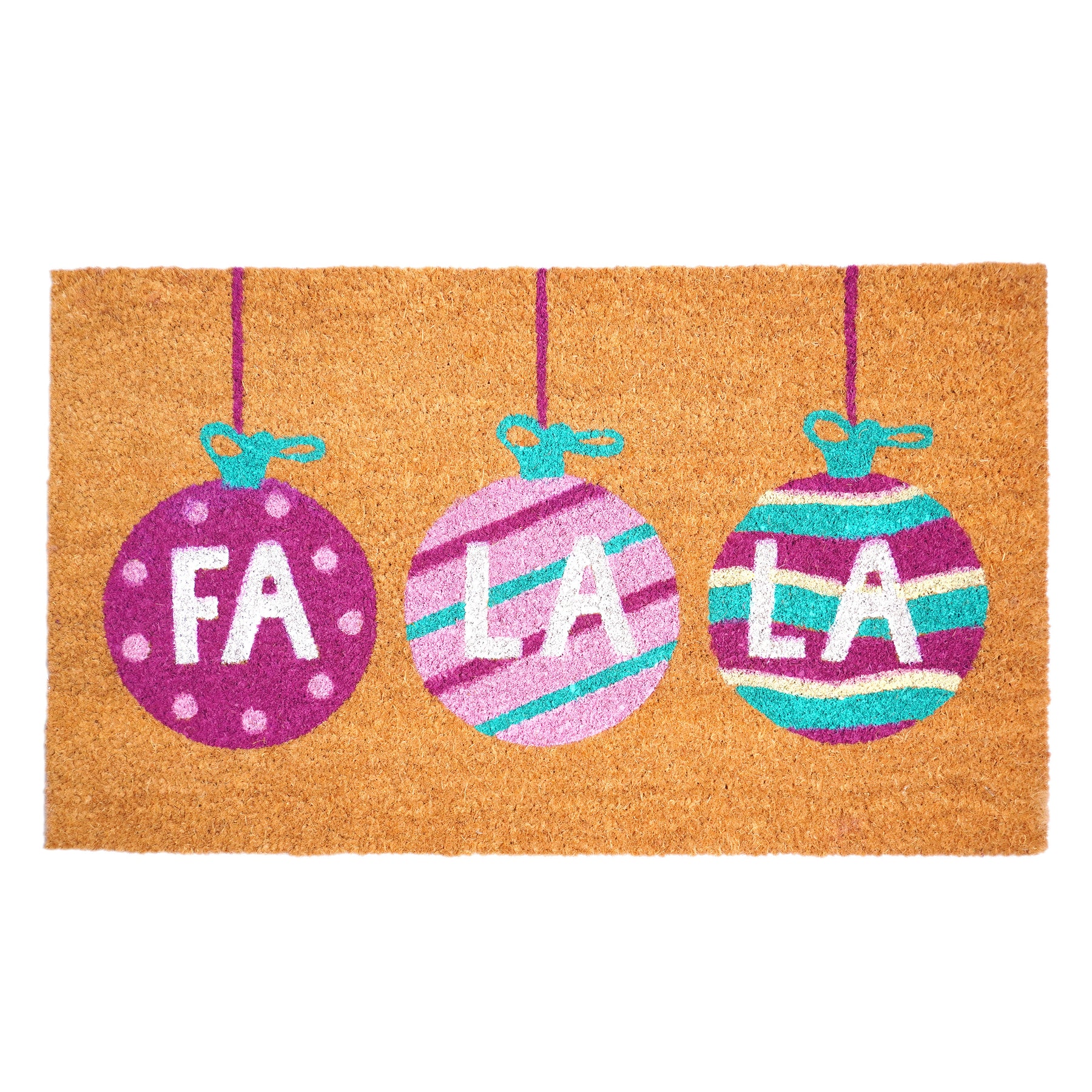 Welcome the joyous melody of the season with our delightful 'Fa La La' Doormat, featuring three charming pink ornaments adorned with the festive phrase. This whimsical mat sets a merry tone for your doorstep, inviting guests to embrace the holiday cheer. Crafted for durability, it ensures a clean entrance while spreading warmth and joy. Embrace the festive spirit as you welcome visitors into your home, where every step is met with the merry jingle of the season.