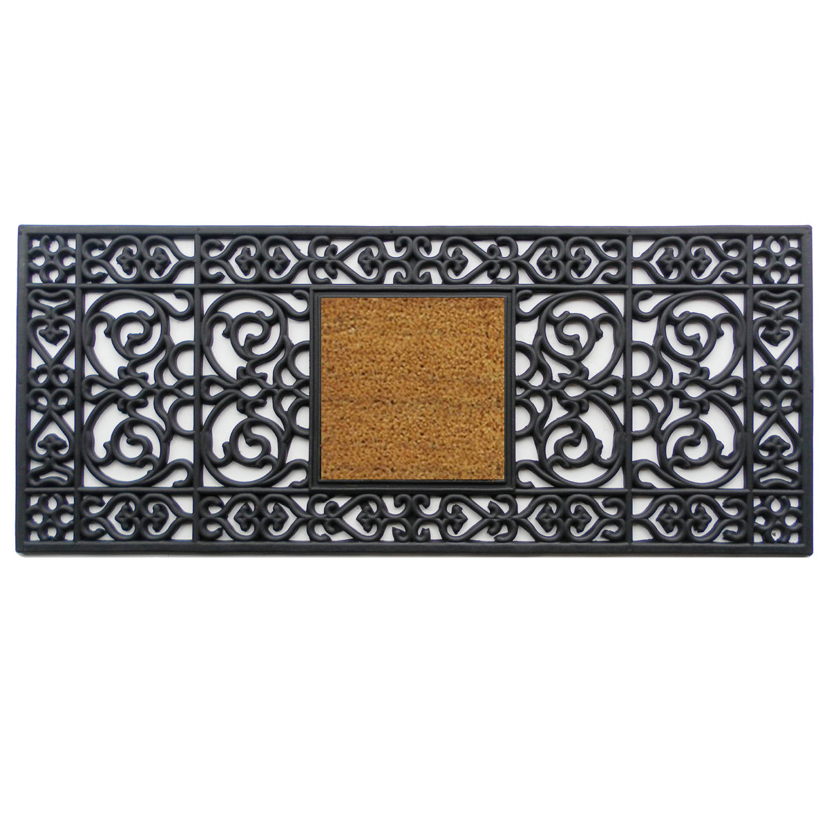 Elevate your entryway with our Rubber Doormat w/ Interchangeable Inserts. Personalize your doorstep with you own initial or one of our vibrant seasonal designs. Adding a touch of sophistication to your home decor. Crafted with durable rubber, this insert offers both style and functionality, making it a timeless addition to any entryway. Made of durable rubber that won't crack or mildew, this unique scroll design creates a look of wrought iron with the charm of old world detail. An excellent choice for double front doors or sliding patio doors, this resilient doormat comes with a removable coir insert that stays in place even when walked on. The insert is made of natural coir, a dense fiber that is naturally mold and mildew resistant.
