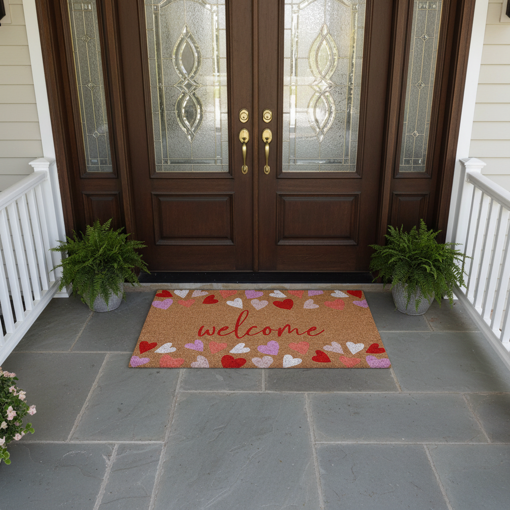 A playful border of hearts runs along the top and bottom, framing the word “welcome” written in an elegant red script at the center. The design feels inviting, festive, and perfect for spreading love at your front door. Perfect for welcoming guests with warmth and personality, this doormat makes a lovely addition to any home or a thoughtful gift for housewarmings and holidays.
